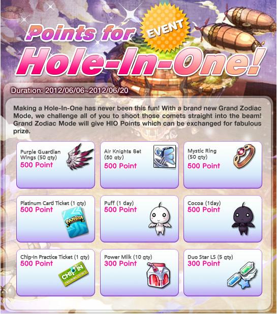 Fazer um Hole in One nunca foi tão divertido! Com um modo de Zodiac novíssimo Grand, desafiamos todos vocês para disparar suas bolas direto para o Beam! O Modo Grand Zodíaco dará HIO's Points, que podem ser trocados por prêmios fabulosos.